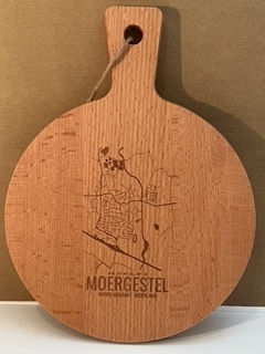 Deze houten snij- en serveerplank is gegraveerd met de plattegrond van Moergestel. Perfect als cadeau voor een echte Moergestelnaar of als stijlvolle blikvanger in je eigen keuken.